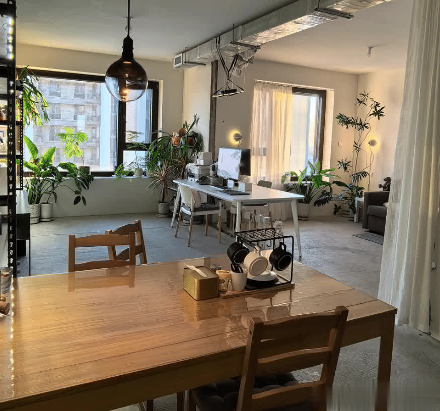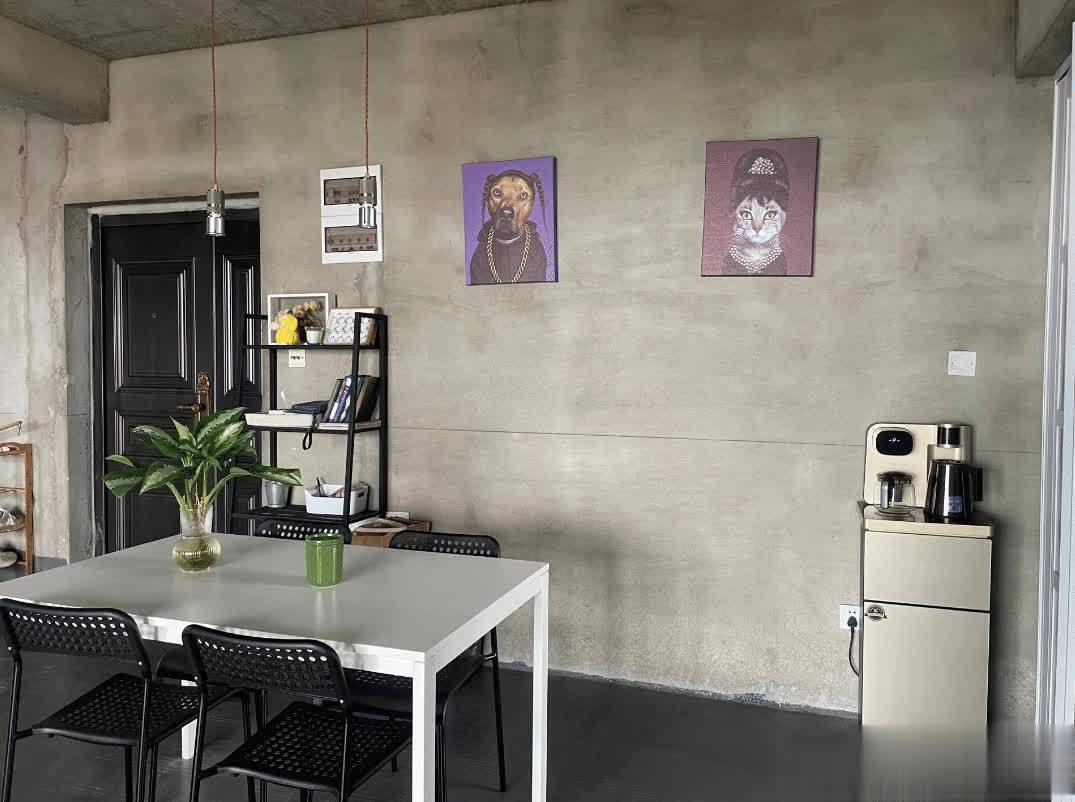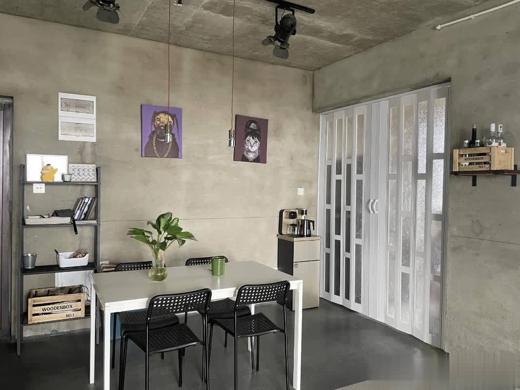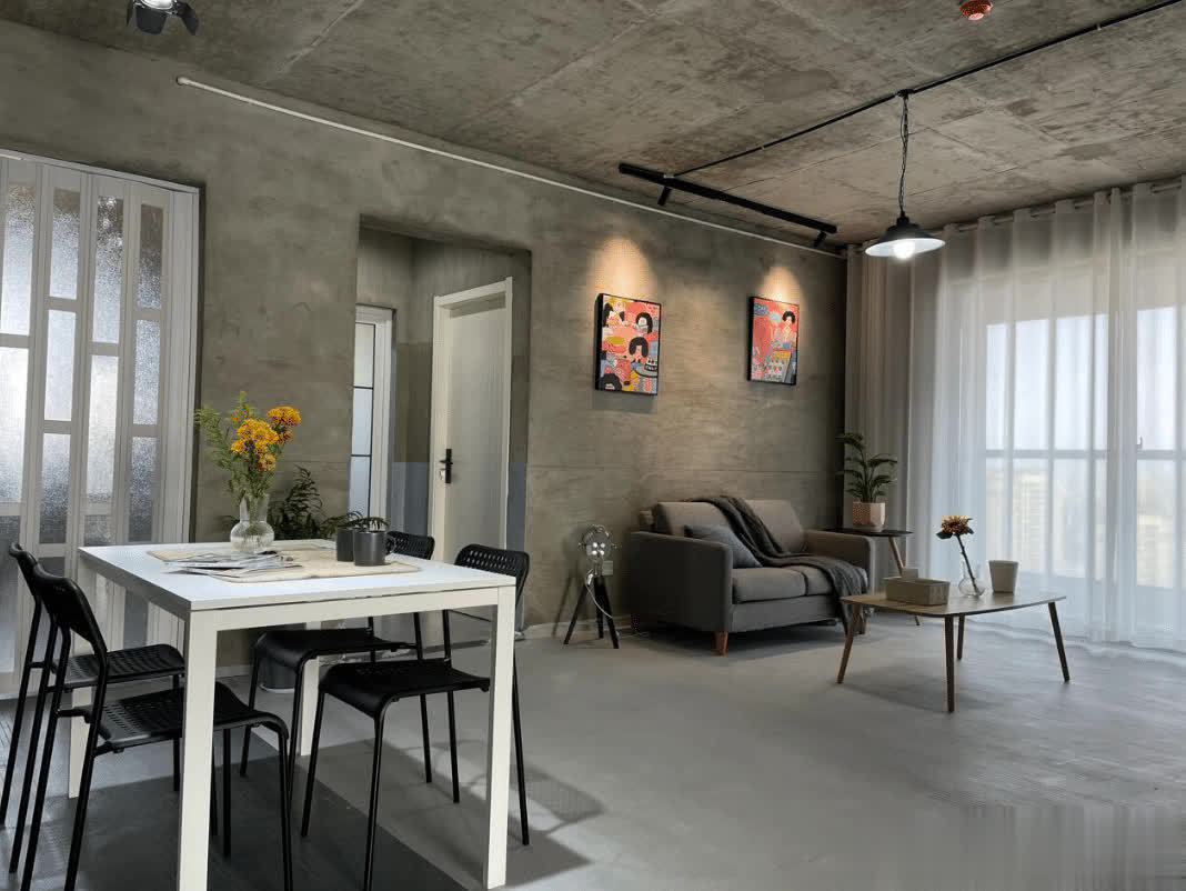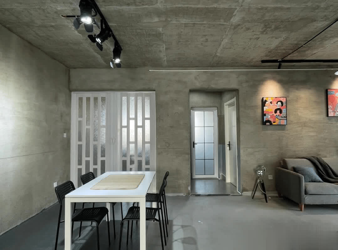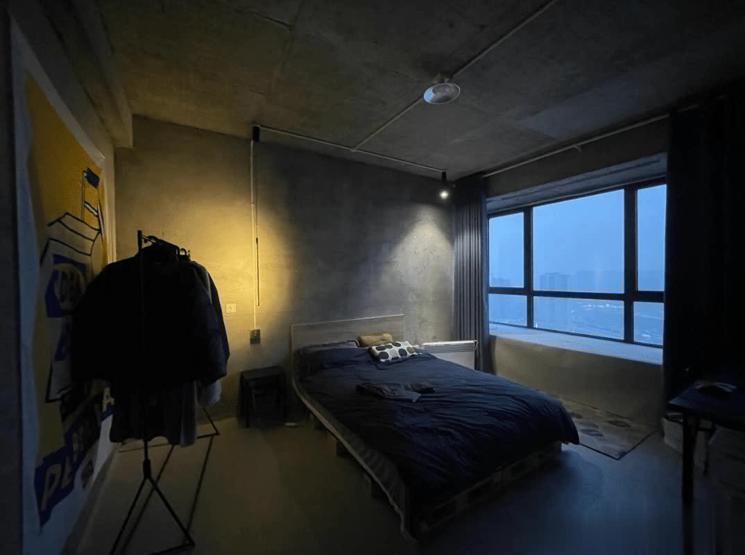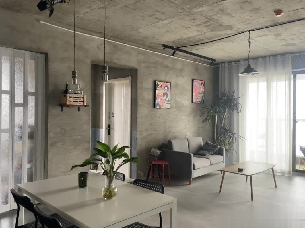 墙面和地面都是保留原有的水泥材质,为了减少起灰的问题,刷上了地坪漆和罩光漆。保留了原本的水泥质感,看着给人一种粗犷的美感。