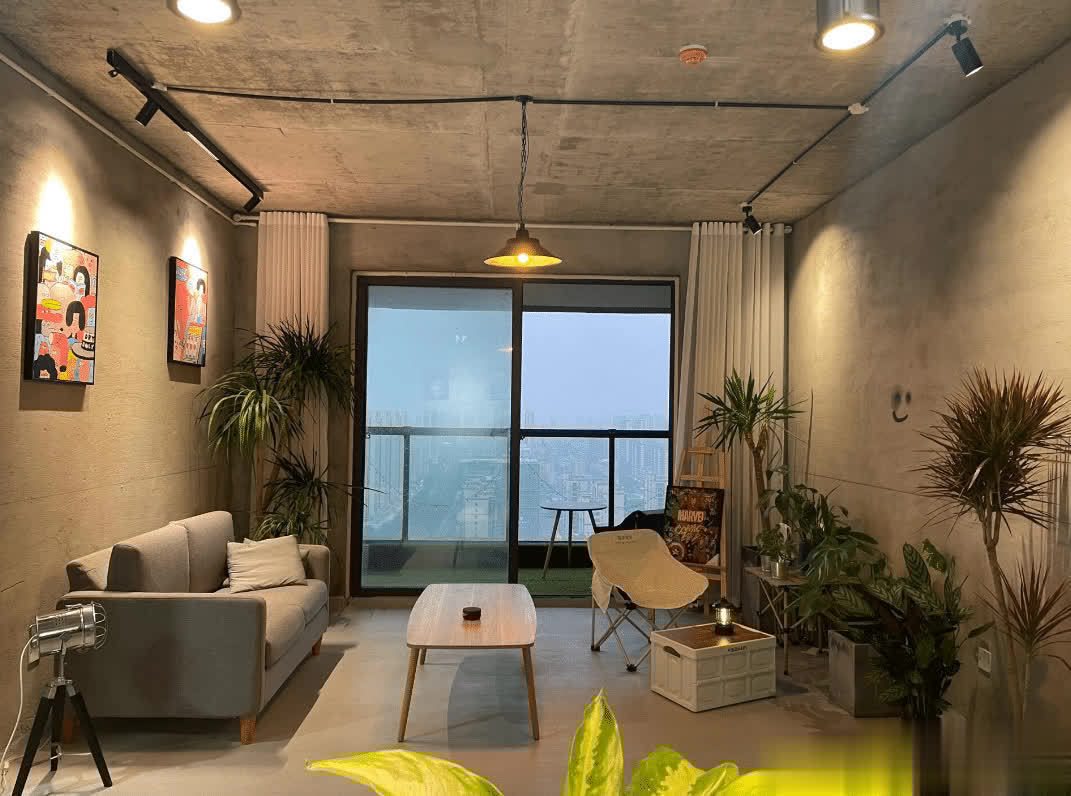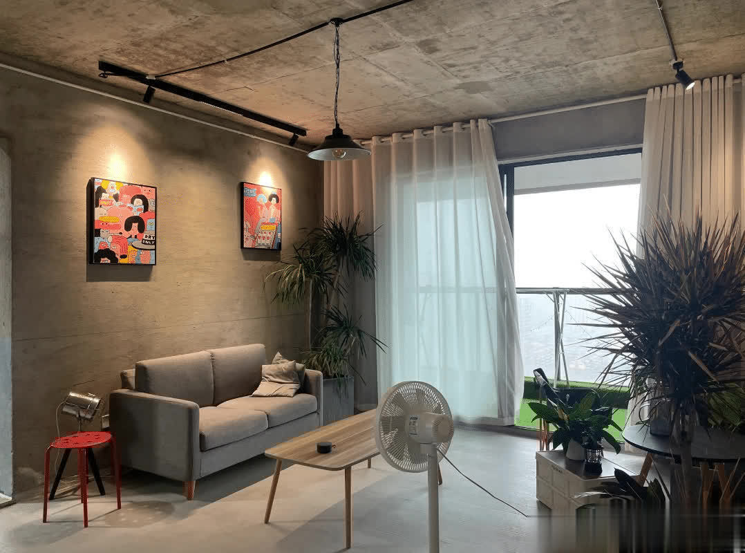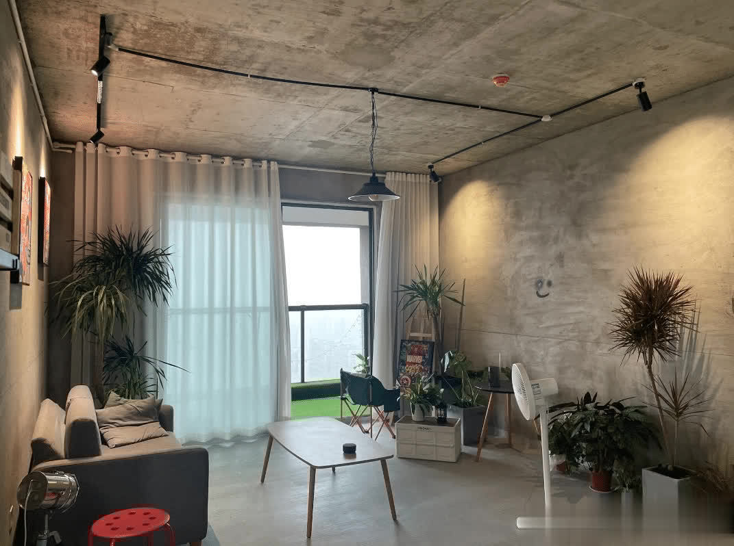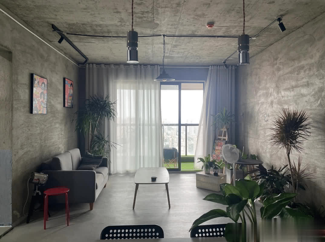 客厅的家具也非常简单,灰色的极简沙发,一张小木桌当茶几来使用。毛坯风的效果的确比较清冷,为了点缀环境,摆放了一些绿植盆栽,让整个空间显得生机盎然。